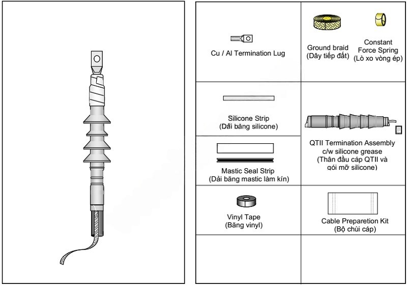- Dải băng silicone xám: dùng để làm kín phần đôi lug của đầu cáp.