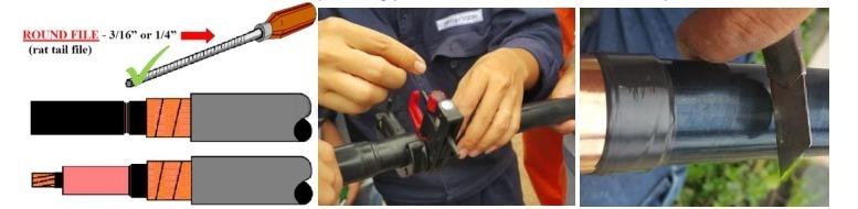 Sử dụng dũa tròn mịn hoặc dụng cụ cắt bán dẫn chuyên dụng (không cho phép dùng dao rọc giấy) để cắt vòng tròn lớp bán dẫn. Khi loại lớp bán dẫn tránh làm xước bề mặt lớp cách điện. Giấy nhám aluminum oxide (có cung cấp) để mài vỏ cáp, không phải để loại bỏ vết cắt sâu trên lớp cách điện.