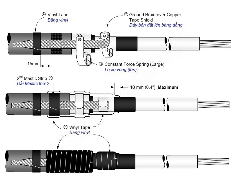 Bước 4: Dùng băng vinyl giữ dây đồng bện tiếp đất vào vỏ cáp ở vị trí cách lớp mastic 15mm ("4" hình 4).