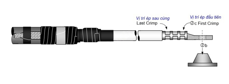 c, Ép đầu lug theo các khuyến cáo của nhà sản xuất. Bắt đầu ép tại vị trí gần lỗ xuyên bulon bắt vào đầu cực thiết bị ("2c" hình 6). Lau chùi mỡ bảo quản nếu bị xì ra trong lúc ép đầu lug.